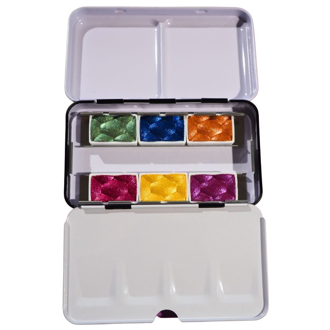 Skrim The Jewels (NEW- October 2025 Edition) is a shimmery watercolor set with 6 full pans, handmade in Germany and artist-grade. Packaged in a professional watercolor box for secure storage and easy organization.